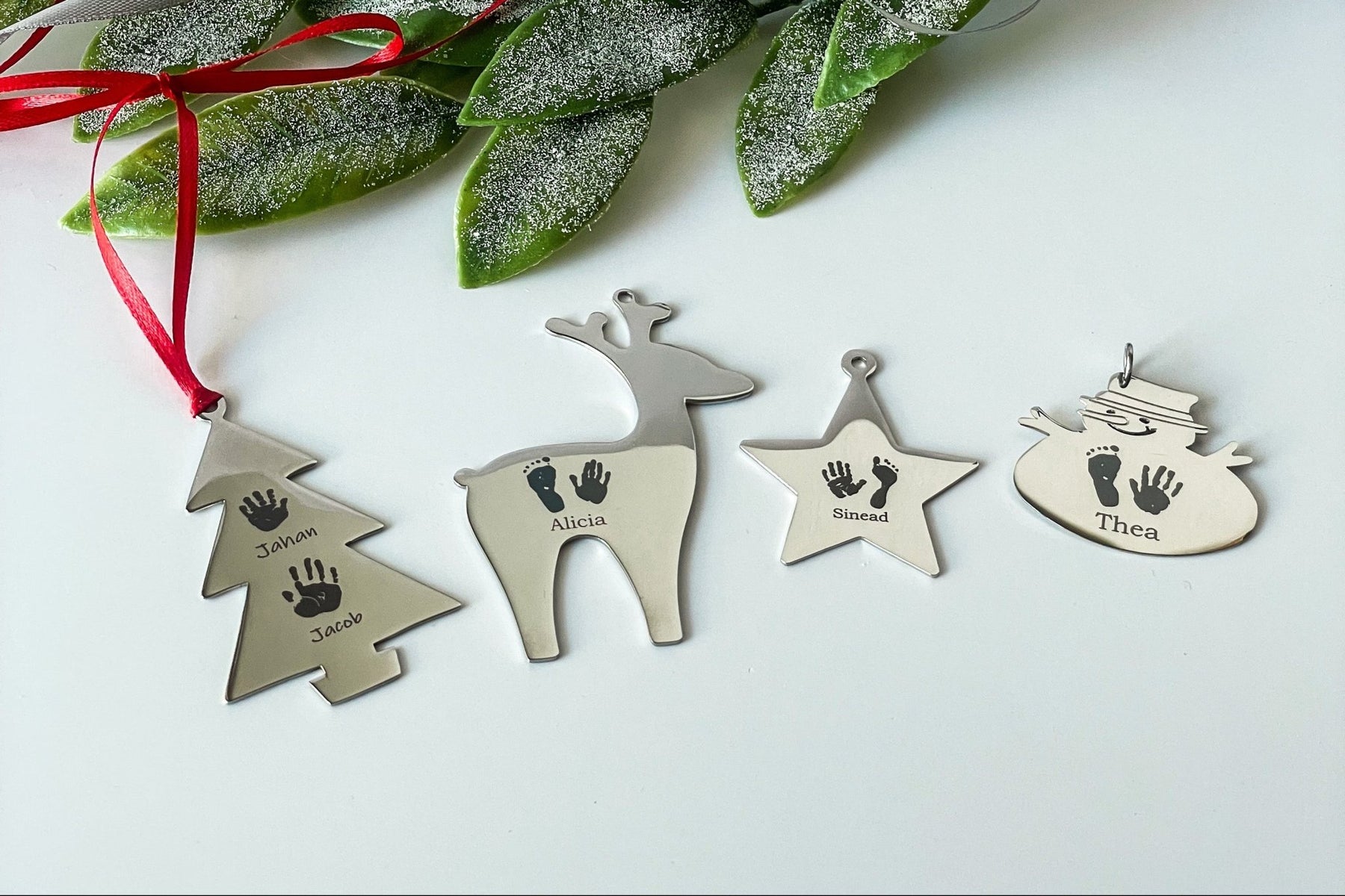 Create a Christmas tradition you can pass down. This engraved ornament captures a real handprint or footprint in polished stainless steel, a small moment preserved beautifully for every Christmas to come.